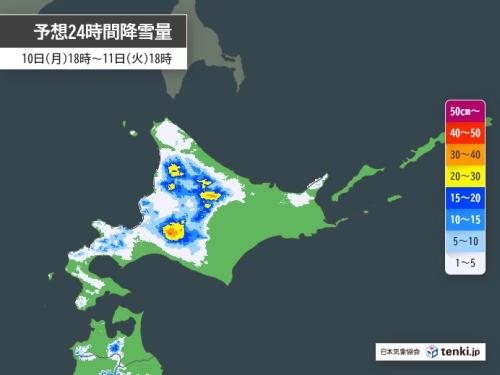 道内は今夜(10日)は道央や道北を中心に天気が崩れ、内陸では次第に湿った雪やみぞれの降る所が多くなりそうです。明日は道央や道北の内陸を中心に断続的に雪で、平地でも積雪状態となる所があるでしょう。峠や山間部などでは局地的に30センチ前後の雪が降る見込みです。また、広い範囲で風が強く、峠などではふぶくおそれもあります。吹雪による見通しの悪さや積雪、凍結などの路面状況の変化に注意して下さい。なお、明日11日(火)は最高気温が11月下旬から12月上旬並みにとどまるため、寒さ対策も必要です。