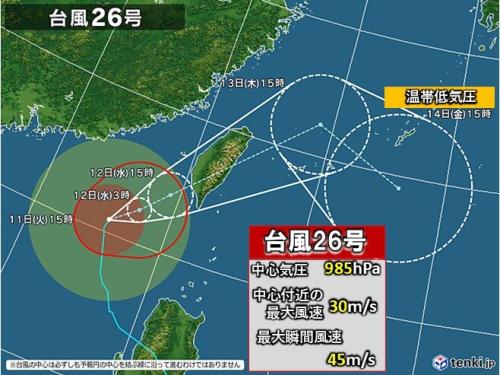 台風26号は、今日11日の午後3時現在、南シナ海を北にゆっくりと進んでいます。中心の気圧は985ヘクトパスカル、中心付近の最大風速は30メートル、最大瞬間風速は45メートルで、暴風域を伴っています。