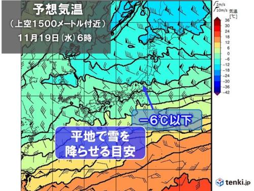 18日(火)から19日(水)は、上空1500m付近に平地で雪を降らせる目安の寒気が、北陸や東北南部付近まで流れ込む見込みです。東北の日本海側から北陸にかけても雪のエリアが広がり、山沿いでは大雪になるおそれがあります。平地でも雪の積もる所があり、東北の太平洋側にも、山沿いを中心に雪雲が流れ込むでしょう。積雪や路面の凍結に注意が必要です。