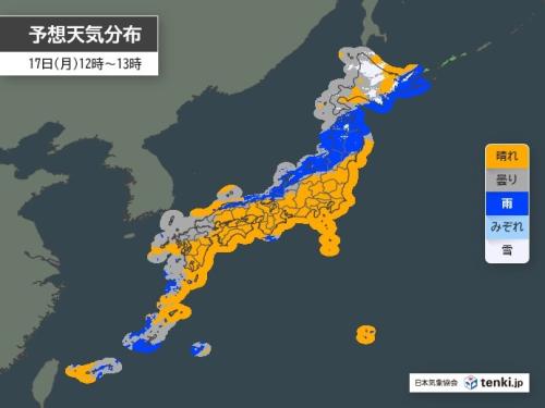 今日17日(月)は、北海道では前線の通過に伴い、風が非常に強く、局地的に雷を伴った激しい雨が降り、大荒れの天気となる見込みです。雪でふぶく所もあるでしょう。東北の太平洋側や北陸から山陰も次第に雨の降る所がありそうです。一方、関東から九州はおおむね晴れる見込みです。ただ、関東甲信や東海の標高の高い所では夜に雪のまじる所があるでしょう。