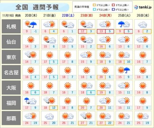 22日(土)からの3連休は広い範囲で晴れて、行楽日和が続く見込みです。日中は日差しの下では暖かく感じられるくらいでも朝晩との気温差は大きいでしょう。昼間は暖かく感じられても、上着やコートは必需品です。
