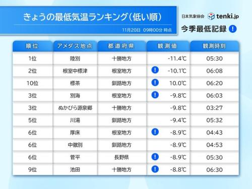 午前9時までに、全国のアメダス地点で最も気温が下がったのは、北海道十勝地方の陸別でマイナス11.4℃でした。北海道根室地方の根室中標津はマイナス10.1℃、釧路地方の標茶ではマイナス10.0℃と、今シーズン初めてのマイナス10℃台を観測しました。