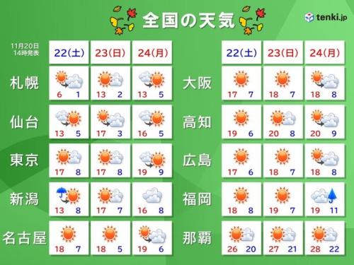 高知や福岡では22日(土)と23日(日・勤労感謝の日)は、最高気温が19℃から20℃くらいまで上がり、日中は長袖シャツ一枚で過ごせるくらいでしょう。