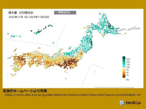 今月(11月)1日から昨日20日までの20日間の合計降水量は、東日本の太平洋側や西日本で平年より大幅に少なくなっています。特に関東や東海、九州北部では平年の20%以下という所も多くなっていて、さいたま市では平年の9%、大分市では平年の14%となっています。