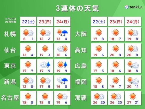 今日22日(土)からの3連休は、日中は広い範囲で晴れてお出かけ日和。関東から九州では、市街地でも紅葉が見頃を迎えている所が多く、紅葉狩りを楽しめそう。昼間は日差しが暖かいが、朝晩はヒンヤリ。調節しやすい服装で、体調管理に注意。