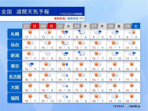 札幌のこの時季の最高気温の平年値は6℃前後ですが、25日(火)までは平年よりかなり高く、その後も平年より高い日が続く見込みです。仙台の最高気温も24日(月・振休)にかけて、平年よりかなり高いでしょう。東京から那覇は、平年並みか平年より高い日が多く、季節の歩みはやや足踏み状態となりそうです。