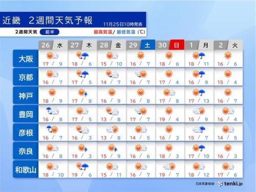 近畿地方では、この先天気は短い周期で変わる見込みです。最も晴れやすいのは29日(土)頃で、絶好の紅葉狩り日和となりそうです。12月はじめまでは気温の変化が大きくなりますが、12月3日(水)頃からは冬らしい寒さが続き、本格的な冬の装い、コートやダウンの出番となるでしょう。空気の乾燥する日も続くため、体調の管理にご注意ください。