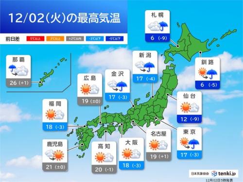 東京都心は17℃と昨日よりは低いものの、11月中旬並みで、この時期としては暖かい見込みです。名古屋市や広島市、高知市、鹿児島市は20℃前後で、日中は暖かいでしょう。