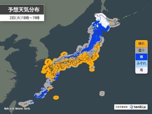 今日2日は北海道や東北、北陸では天気が下り坂。午後は雨が降り、北海道では雪の降るところもありそうです。また大気の状態が不安定で、落雷や突風にも注意が必要です。一方、関東から九州にかけては、日中は日の差す所が多くなりそうです。