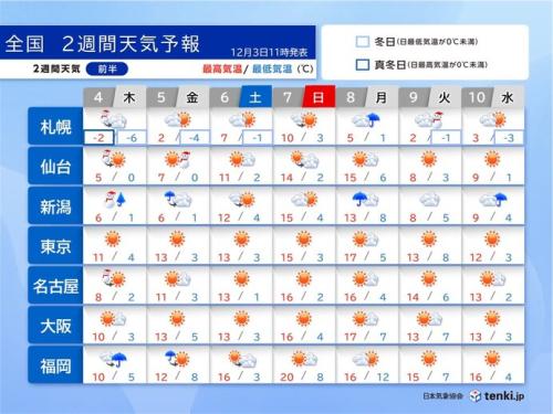 最高気温は、平年並みの所が多いでしょう。北海道は平年並みか低く、札幌市は13日(土)と14日(日)はマイナス1℃の予想で、真冬日(最高気温が0℃未満)となりそうです。東北から九州にかけては、朝晩は冷え込みの強まる日が多く、昼間との寒暖差が大きくなります。外出する時間に合わせて服装をうまく調節して、体調を崩さないよう、気をつけてお過ごしください。
