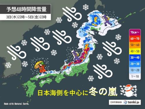 今夜は次第に冬型の気圧配置が強まる。4日(木)にかけて九州から北海道の日本海側を中心に広い範囲で雪。沿岸には冷たい風が吹き付け冬の嵐に。大雪になる所も。交通機関への影響に警戒。5日(金)になると西から天気は回復するが、北陸から北の日本海側では引き続き大雪に注意を。
