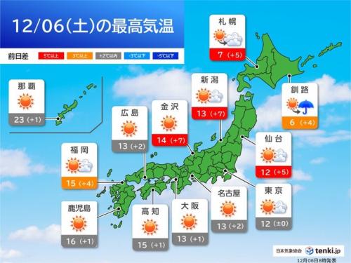 関東から九州は、昨日と同じくらいか高く、師走らしい寒さが続くでしょう。