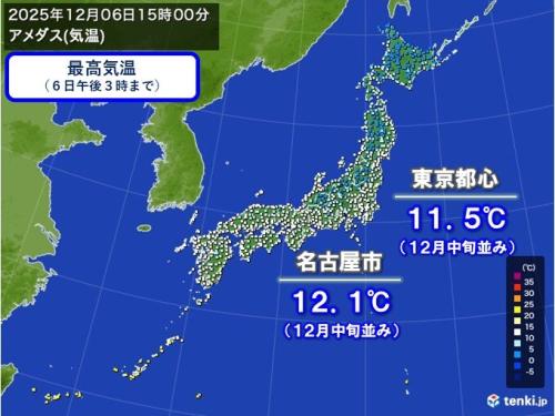 各地の最高気温は東京都心で11.5℃(12月中旬並み)、名古屋市で12.1℃(12月中旬並み)など、平年並みか平年を下回った所がほとんどでした。