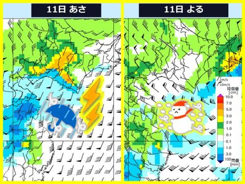 明日11日は低気圧や前線が北日本を通過します。東北北部は午前中は短時間の強い雨や落雷、突風に注意が必要です。北海道は沿岸を除いて雪や吹雪で、大雪山系などは大雪の恐れがあります。
