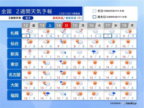 13日(土)は再び低気圧が通過する見込みです。西日本を中心に雨雲が広がるでしょう。14日(日)は再び強い冬型の気圧配置となり、15日(月)にかけて、北海道や東北の日本海側、北陸を中心に荒れた天気となりそうです。特に北海道や東北の日本海側は強い雨や雪、暴風の恐れがあります。交通機関への影響に注意が必要です。関東では13日(土)~14日(日)に内陸で雪の可能性がありますので、今後の情報にもご注意ください。13日(土)は、東京都心も最高気温が10℃に届かず、グッと寒くなるでしょう。