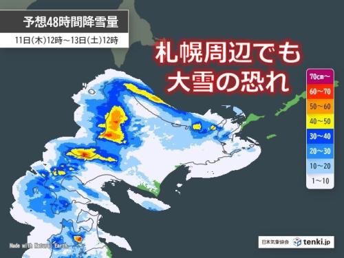 ●明日12日は日本海側は大雪の恐れ 札幌など昼間もマイナス4℃前後の厳しい寒さに