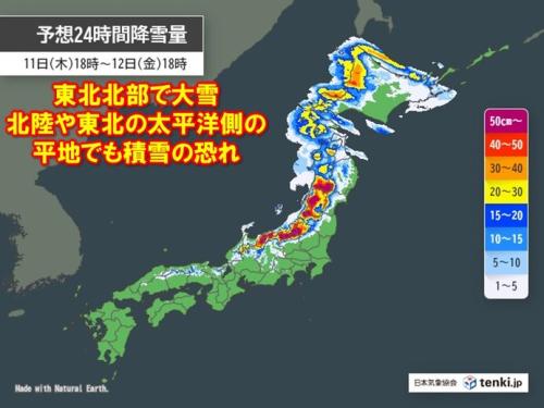 東北北部では特に雪が強まり、24時間最大で60センチ(11日6時~12日6時)、さらに50センチ(12日6時~13日6時)の降雪が予想されています。