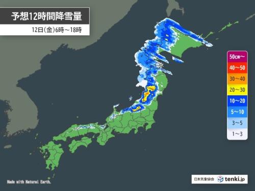 今日12日は、強い冬型の気圧配置となり、北海道と東北の日本海側を中心に雪でふぶくでしょう。大雪やふぶき、吹き溜まりによる交通障害に十分にご注意ください。北陸も雪や雨が降るでしょう。近畿北部や山陰も昼頃まで雨や雪が降りそうです。関東から九州にかけての太平洋側はおおむね晴れますが、北よりの風が冷たいでしょう。