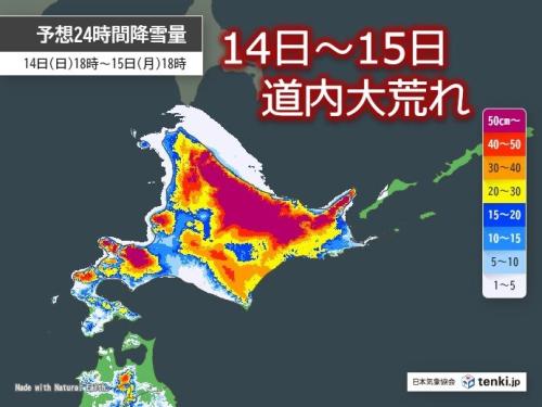 しかし、明日14日(日)から明後日15日(月)にかけては大荒れの天気となる見込みです。低気圧が急速に発達しながら北海道付近に近づき、通過するため、道内は広く湿った雪が降るでしょう。また、低気圧が近いため、風も強まる見込みです。風や雪のピークは明日14日(日)夜から明後日15日(月)となるでしょう。