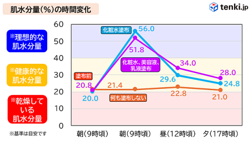 別の日(朝は気温24℃・相対湿度37%、夕方は気温25℃・相対湿度36%)に何も塗らなかった場合と比べても、化粧水の効果は明らかでした。