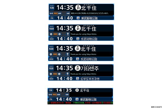 東京メトロは、現行のLEDから液晶ディスプレイの新型行先案内表示器(日本信号 薄型情報表示システム HALF LCD eco)に変更する。