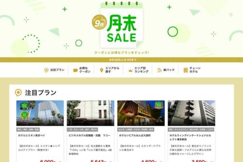 楽天グループは、旅行予約サイト「楽天トラベル」で、「月末SALE」を9月19日午前10時から30日午前9時59分まで開催する。