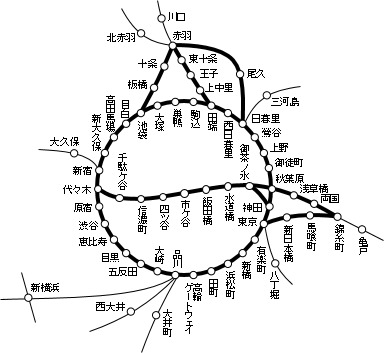 東京付近の特定区間(いわゆる第70条区間、図中太線区間)では、通過する場合の普通旅客運賃・料金を最も短い経路で計算することにしているが、東海道新幹線の東京~品川駅間を除外する。