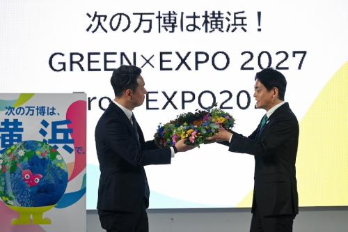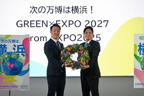 きょう10月13日に最終日を迎えた大阪・関西万博で、2027年に横浜市で開催される国際園芸博覧会「GREEN×EXPO 2027」(横浜花博)へのホストシティ引継ぎ式が行われた。大阪市の横山英幸市長と横浜市の山中竹春市長が出席し、フラワーリースで“バトンタッチ”した。