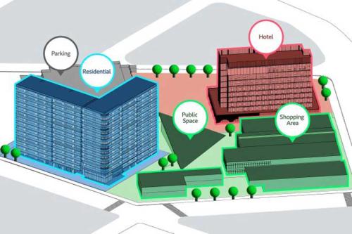 マンションやホテルと隣接した形で、飲食店などの小売店が含まれた商業施設とパブリックスペースも設ける。企画・プロデュースはスマイルズが担う。