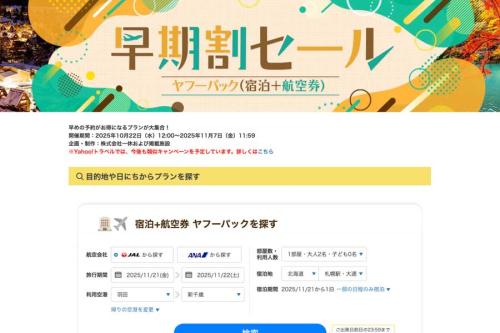 LINEヤフーは、旅行予約サイト「Yahoo!トラベル(ヤフートラベル)」の航空券と宿泊がセットとなったダイナミックパッケージで「早期割セール」を10月22日正午から11月7日正午まで開催している。