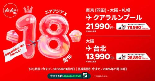 エアアジアXは、「就航18周年記念セール」を10月27日から11月2日まで開催する。